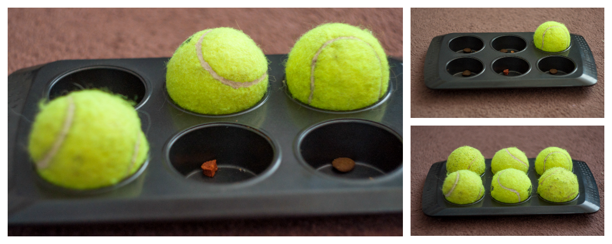 Pro první fázi tohoto hlavolamu vám bude stačit forma na muffiny, tzv. muffinovník. Pro vyšší lvl můžete použít tenisáky či jakékoli balónky, které jistě doma najde každý, k zakrytí děr s pamlsky.Krok 1 - vezměte muffinovník a do každé prohlubně dejte pamlsek