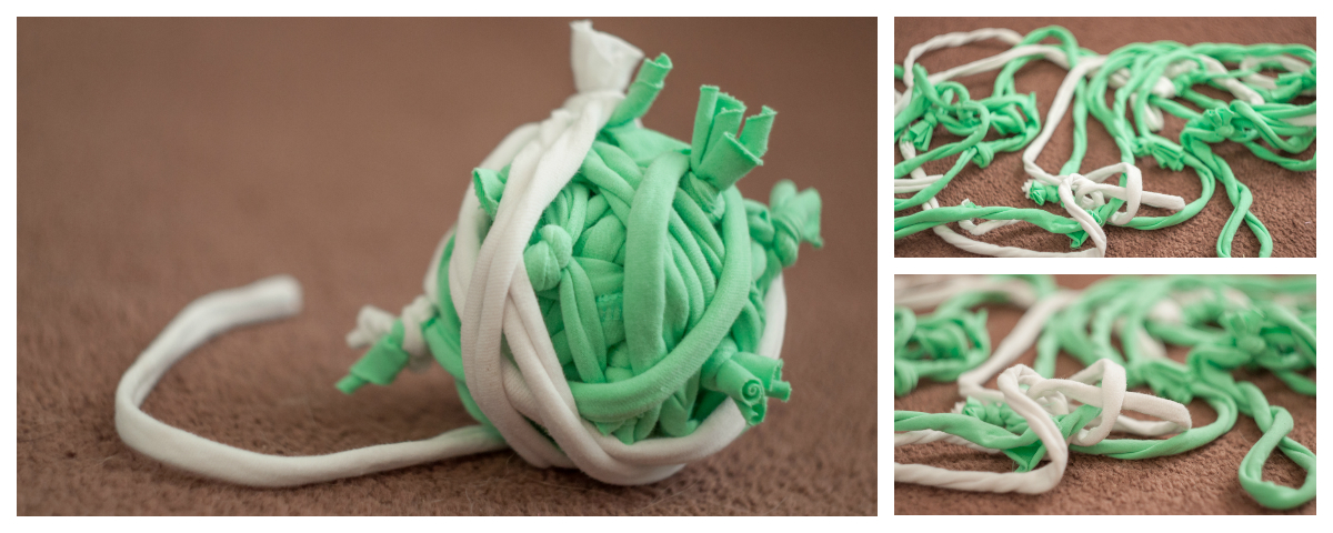 Další hlavolam, který si můžete bez problémů vyrobit doma. Stačí rozstříhat jedno až dvě stará trička na proužky, které následně svážete k sobě a tak vám vznikne delší šňůra.Verze 1 - Šňůra s pamlsky
